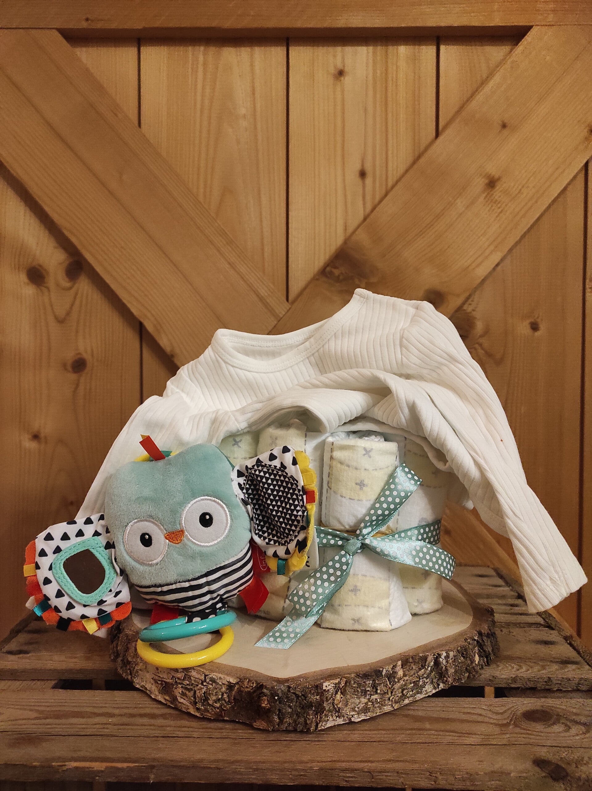 Deze taart omvat 14 pampers met een bijtring en babypakje.